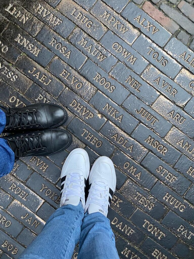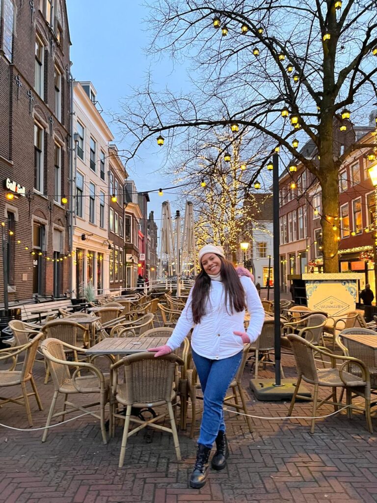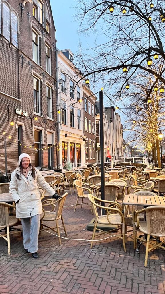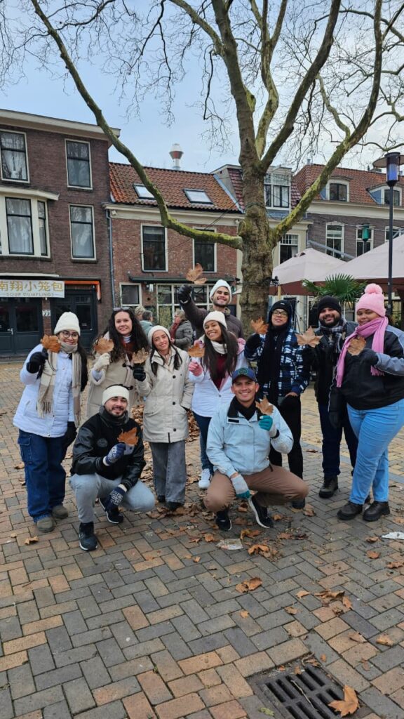 Tivemos então nosso primeiro passeio (saída oficial), os corações ansiosos para conhecer os lugares e suas histórias. Às 15h nossos pais holandeses estavam prontos nos esperando para sair, finalmente chegamos ao centro de Delft para uma visita guiada por Joop, ficamos maravilhados com cada detalhe, a iluminação do natal ainda presente por toda cidade, o frio congelante, mas o coração aquecido de tanto amor e cuidado partido dos nossos pais, que sempre nos perguntavam se estávamos com frio, “bem aquecidos?”, histórias das construções locais, a casa Klaeuwswofji que abriga senhoras solteiras, os canais, a maior ponte de Delft, que pensávamos ser uma rua, tomamos um chocolate quentinho para aquecer o corpo, em um restaurante muito aconchegante chamado `T Postkantoor, ao fim da tarde seguimos andando pelo centro da cidade, experimentamos Oliebol, uma massa frita, semelhante ao sonho que temos no Brasil, ao retornar para o estacionamento nossa “Moeder”  mãe não sabia aonde tinha estacionado mais o seu carro, e fomos a procura dele para retornamos para a Kruithuis.