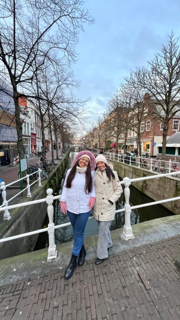 Fiquei imaginando você no meio do grupo, aprendendo a falar “ananas” com a turma, rindo das “bolinhas” do Vini, caminhando por Delft maravilhada com as luzes e sendo cuidada com tanto carinho pelos pais holandeses. É lindo saber que você está se sentindo em casa mesmo tão longe.