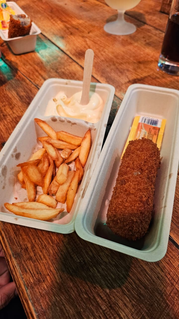 Chegamos a De Uithof, para almoçarmos um prato tipicamente holandês, batata frita, kaassoufflé e croquete, alguns pediram para beber coca-cola e sprite, outros foram de chá gelado.